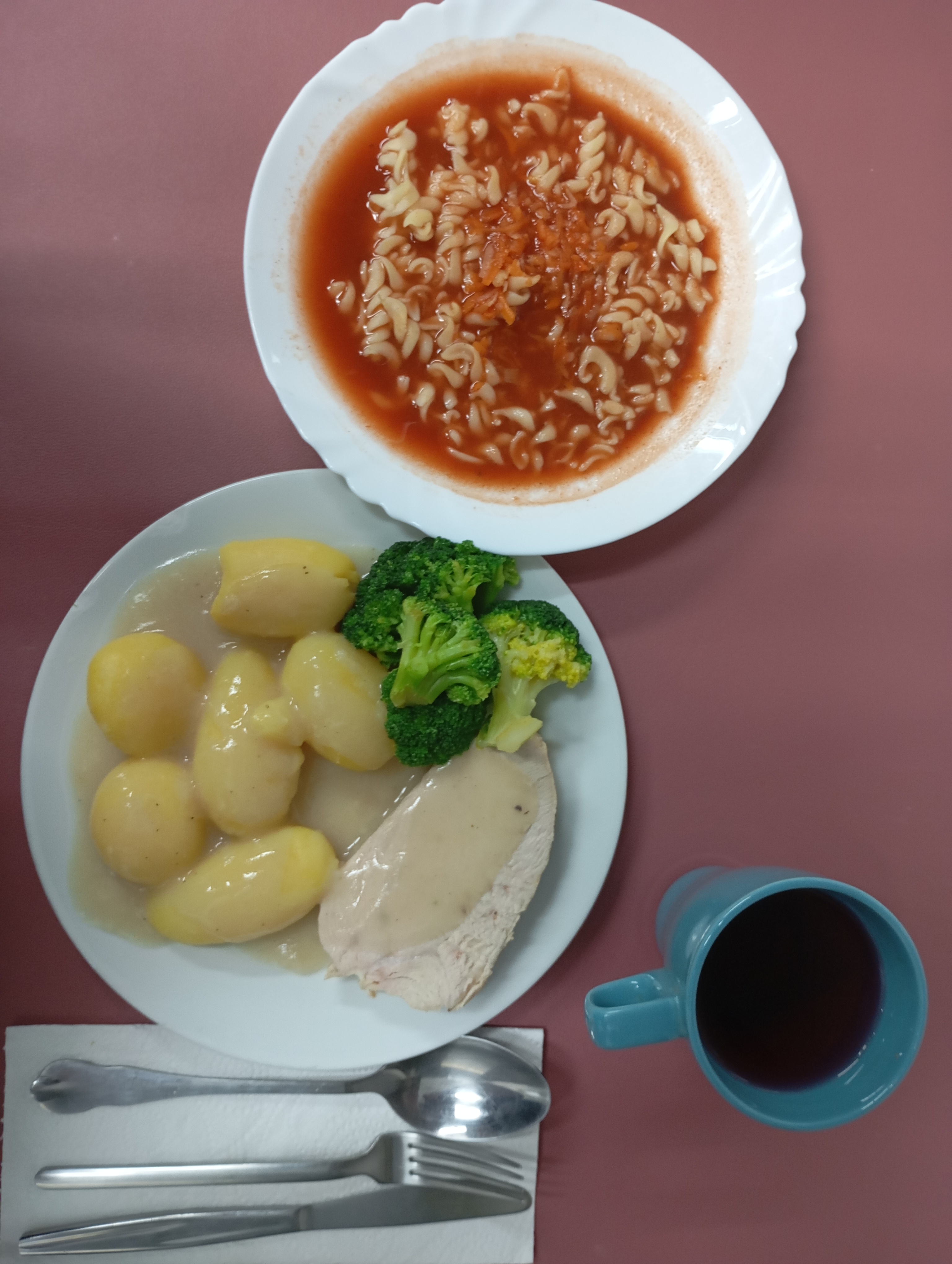 Składniki: zupa pomidorowa z makaronem 350 ml, filet z indyka duszony 110 g, sos własny 100 ml, brokuł z wody 150 g, ziemniaki z koperkiem 250 g, kompot owocowy bez cukru 250 ml
