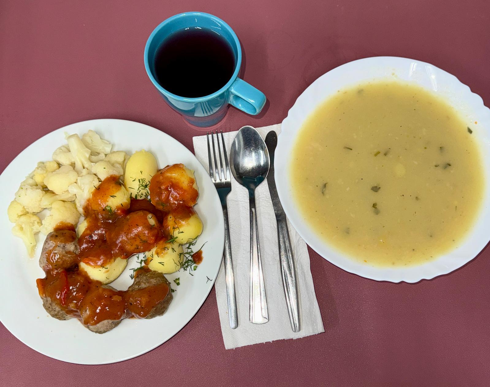 Składniki: zupa z białych warzyw krem 350 ml, klopsiki w sosie pomidorowym 200 g, kalafior z wody 150 g, ziemniaki z koperkiem 250 g, kompot owocowy bez cukru 250 ml