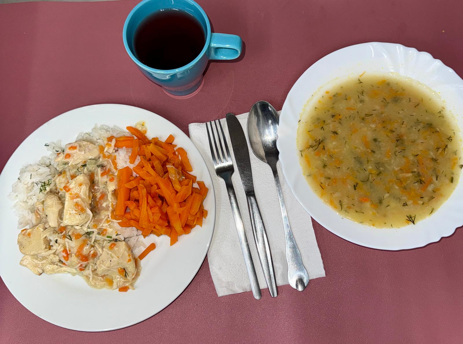 Składniki: zupa koperkowa z ziemniakami 350 ml, potrawka z kurczaka 200 g, ryż na sypko 250 g, marchew gotowana 150 g, kompot owocowy bez cukru 250 ml