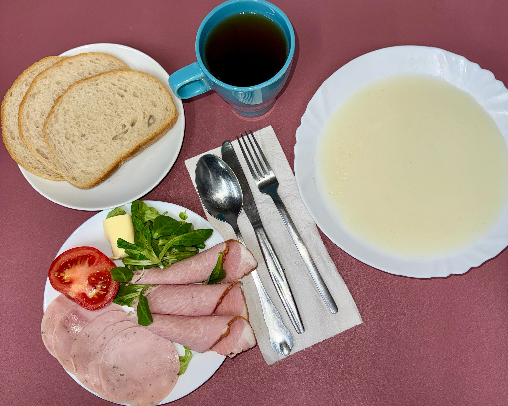 Składniki: zupa mleczna z kaszką manną 250 ml, polędwica drobiowa 50 g, kiełbasa krakowska 50 g, pomidor 60 g, roszponka 15 g, masło 10 g, pieczywo pszenne 90 g, herbata ziołowa 250 ml