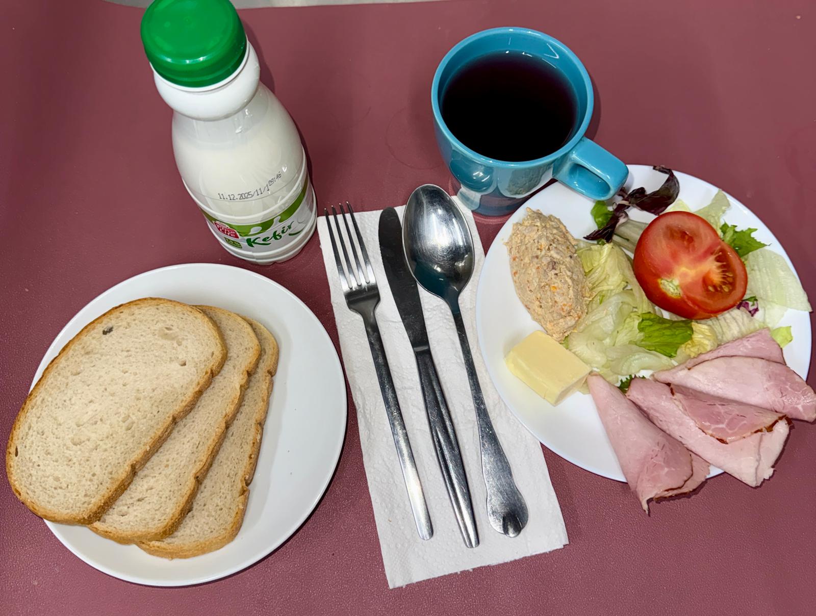 Składniki: kefir 200 ml, pasta z drobiu z jarzynami 70 g, polędwica drobiowa 50 g, pomidor 60 g, roszponka 15 g, masło 10 g, pieczywo pszenne 90 g, herbata owocowa 250 ml