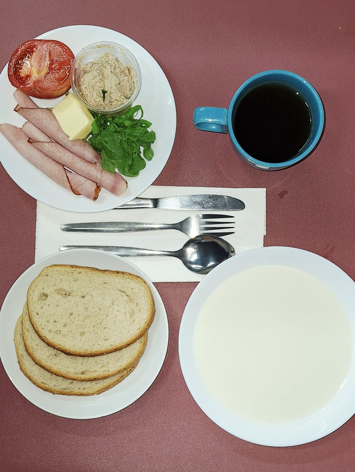 Składniki: zupa mleczna z kaszą jęczmienną 250 ml, pasta mięsna 70 g, szynka drobiowa 50 g, pomidor 60 g, rukola 15 g, masło 10 g, pieczywo pszenne 90 g, herbata b/c 250 ml