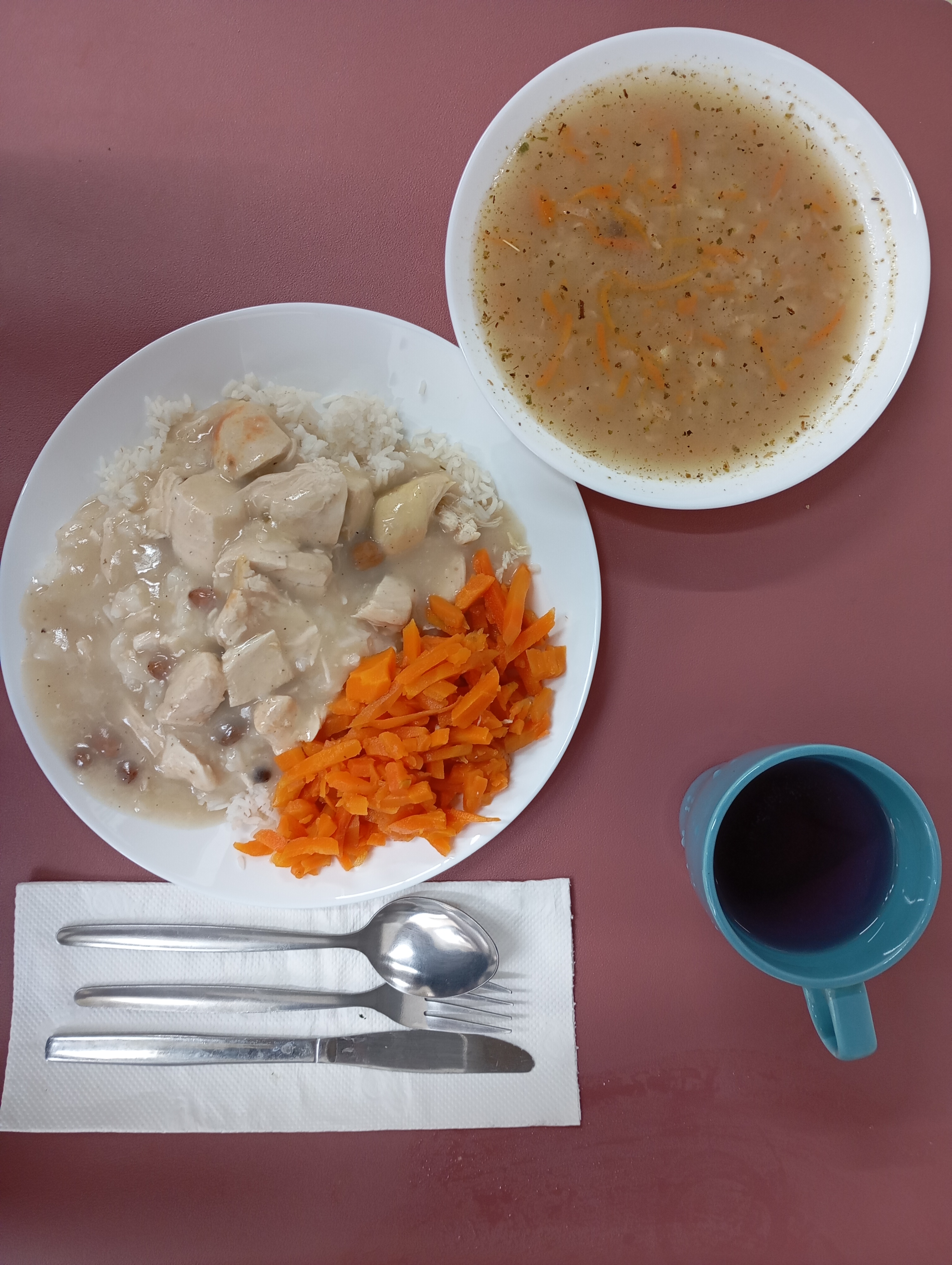 Składniki: Ziemniaczanka 350 ml, kawałki kurczaka w sosie potrawkowym z rodzynkami 200 g, ryż na sypko 250 g, marchew gotowana 150 g, kompot owocowy bez cukru 250 ml