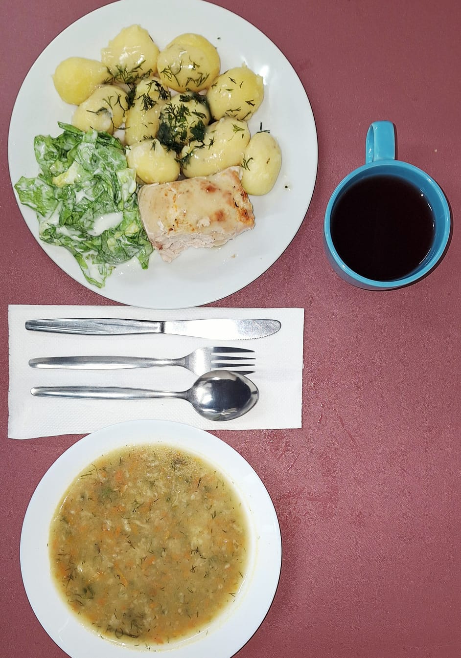 Składniki: zupa koperkowa z lanym ciastem 350 ml, rolada drobiowa z warzywami duszona 110 g, sałata z jogurtem 150 g, ziemniaki z koperkiem 250 g, kompot owocowy bez cukru 250 ml