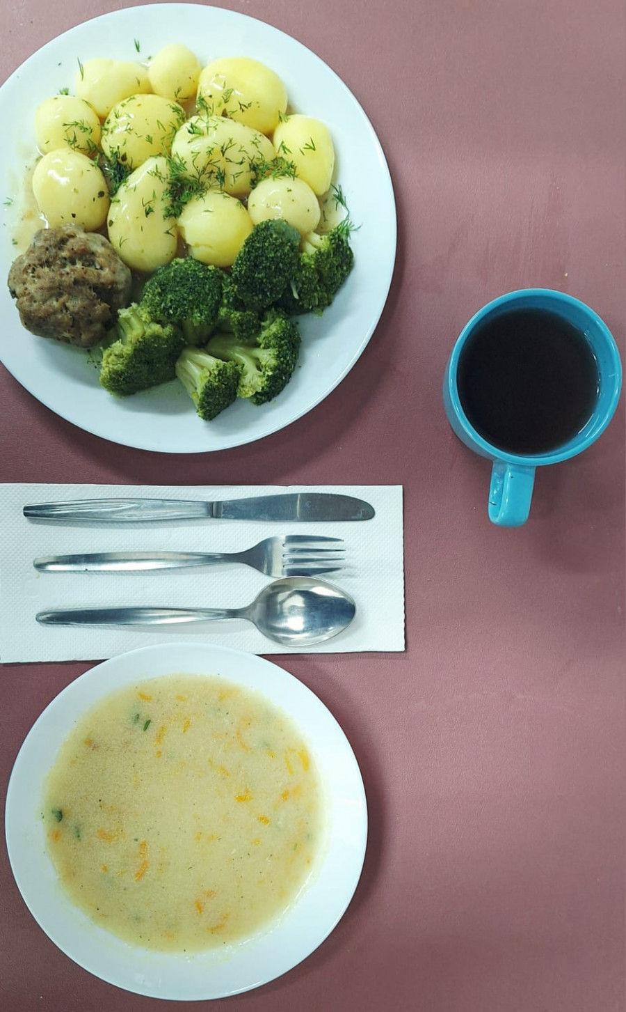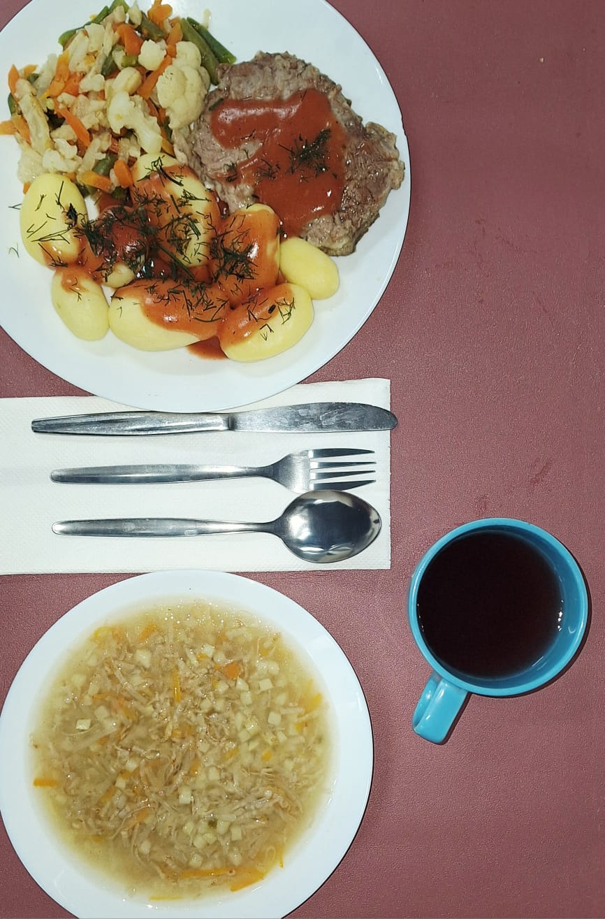 Składniki: Rosół z kaszką manną 350 ml, pulpet wieprzowy duszony 110 g, sos ziołowy 100 ml, brokuł z wody 150 g, ziemniaki z koperkiem 250 g, kompot owocowy bez cukru 250 ml