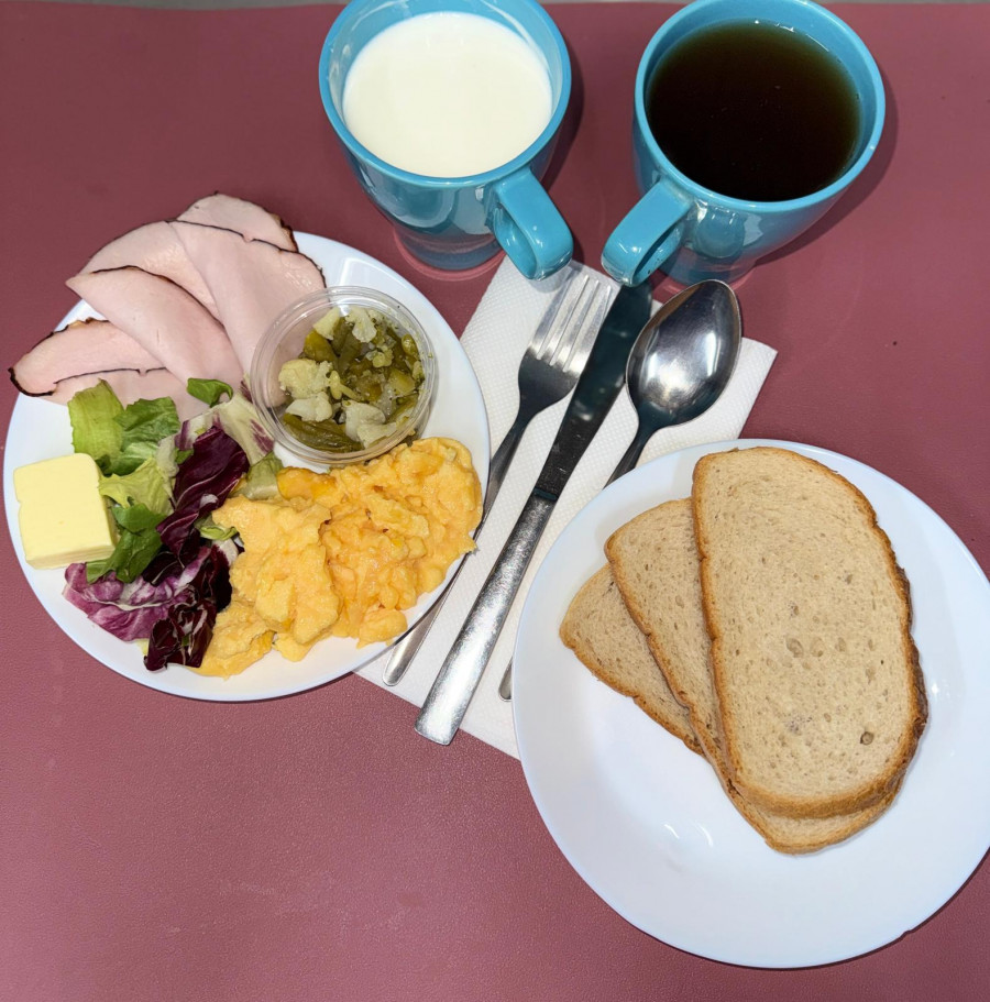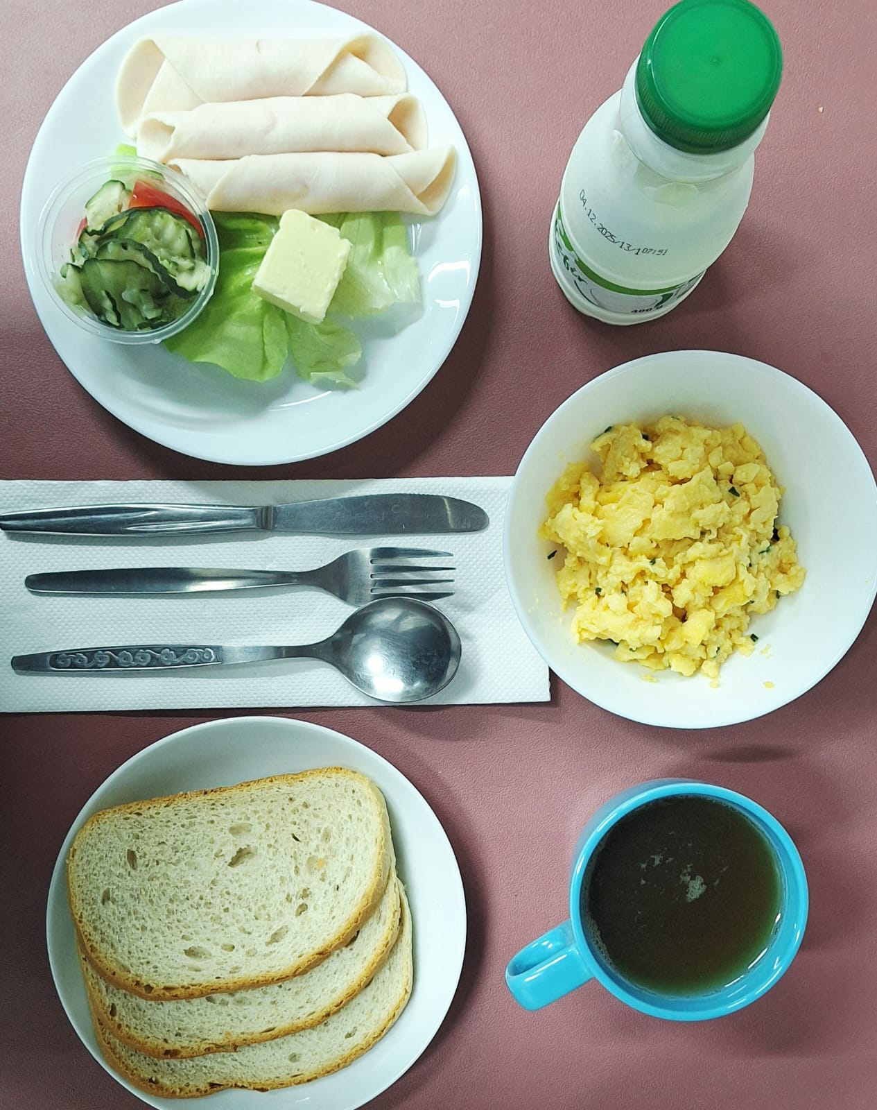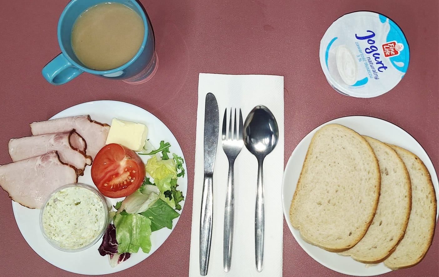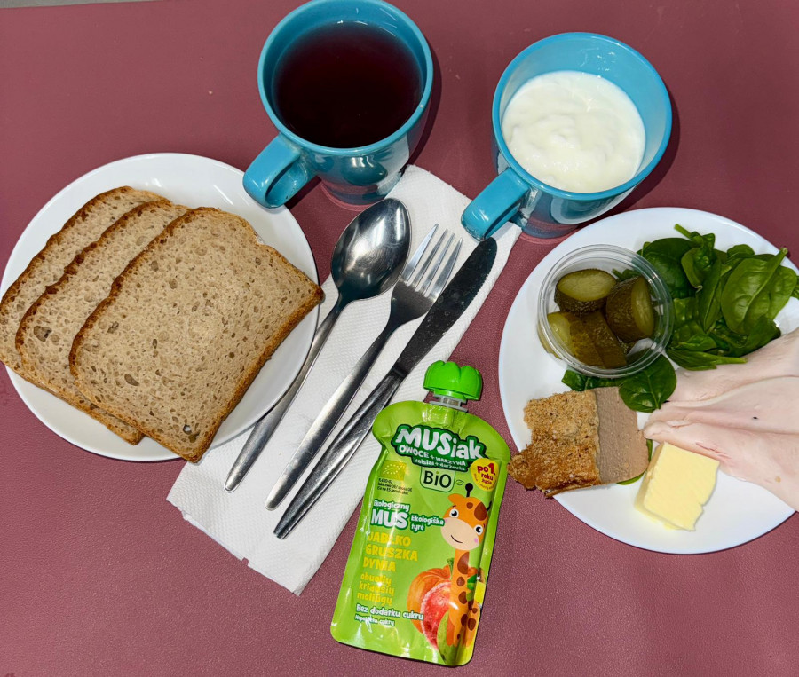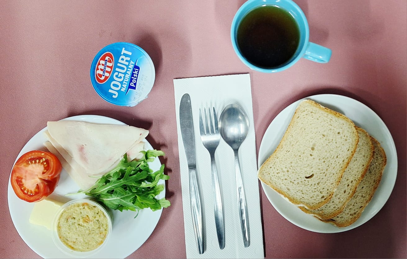 Składniki: jogurt naturalny 1 szt., jajecznica z zieleniną 70 g, szynka drobiowa 50 g, bukiet jarzyn z wody 60 g, mix sałat 30 g, masło 10 g, pieczywo pszenne 90 g, herbata b/c 250 ml