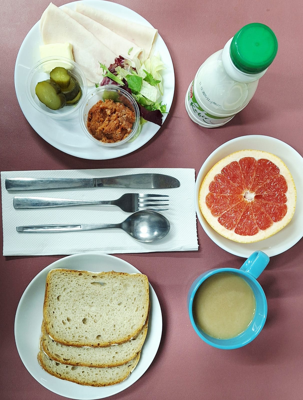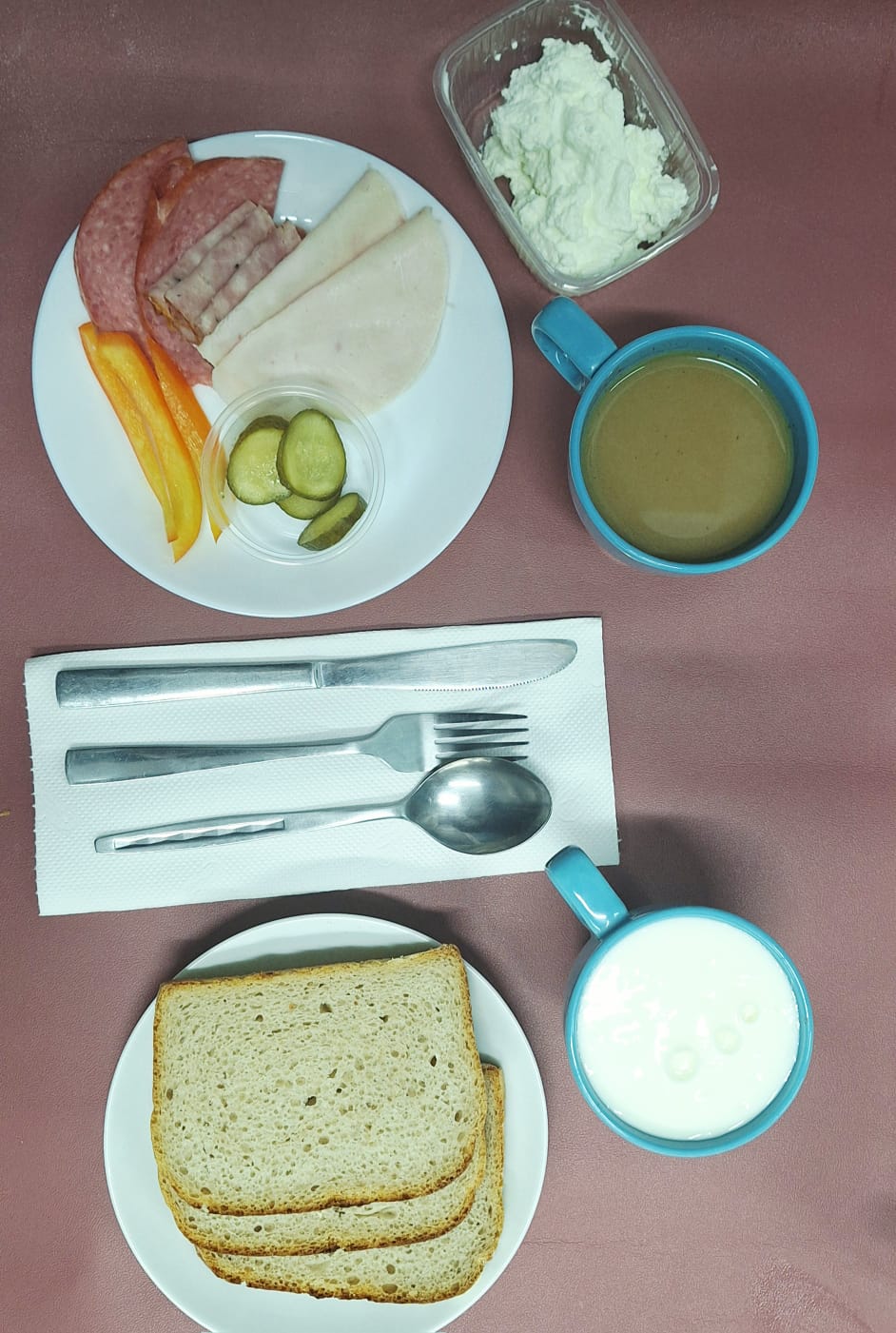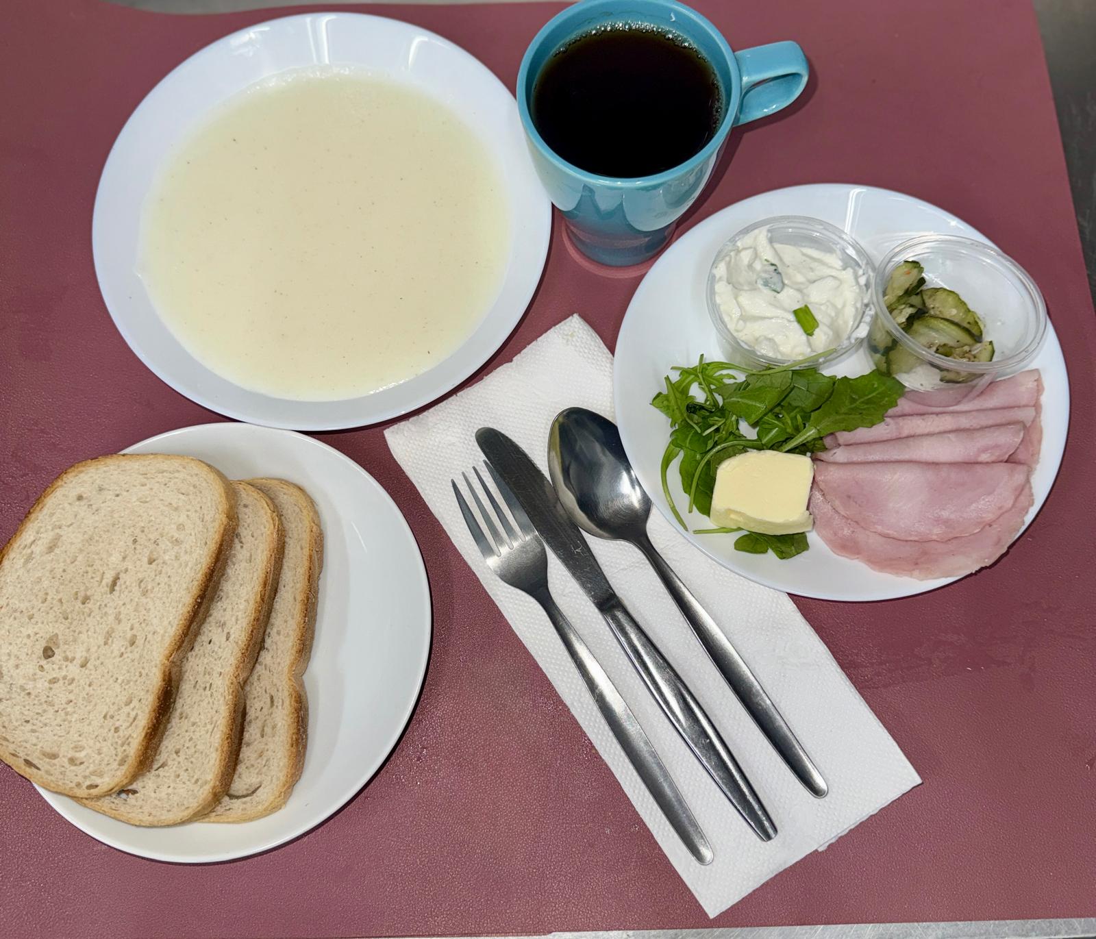Składniki: kefir 200 ml, pasta z ryby gotowanej z warzywami 70 g, szynka drobiowa 50 g, ogórek kiszony 60 g, mix sałat 30 g, masło 10 g, pieczywo razowe 90 g, kawa zbożowa z mlekiem bez cukru 250 ml