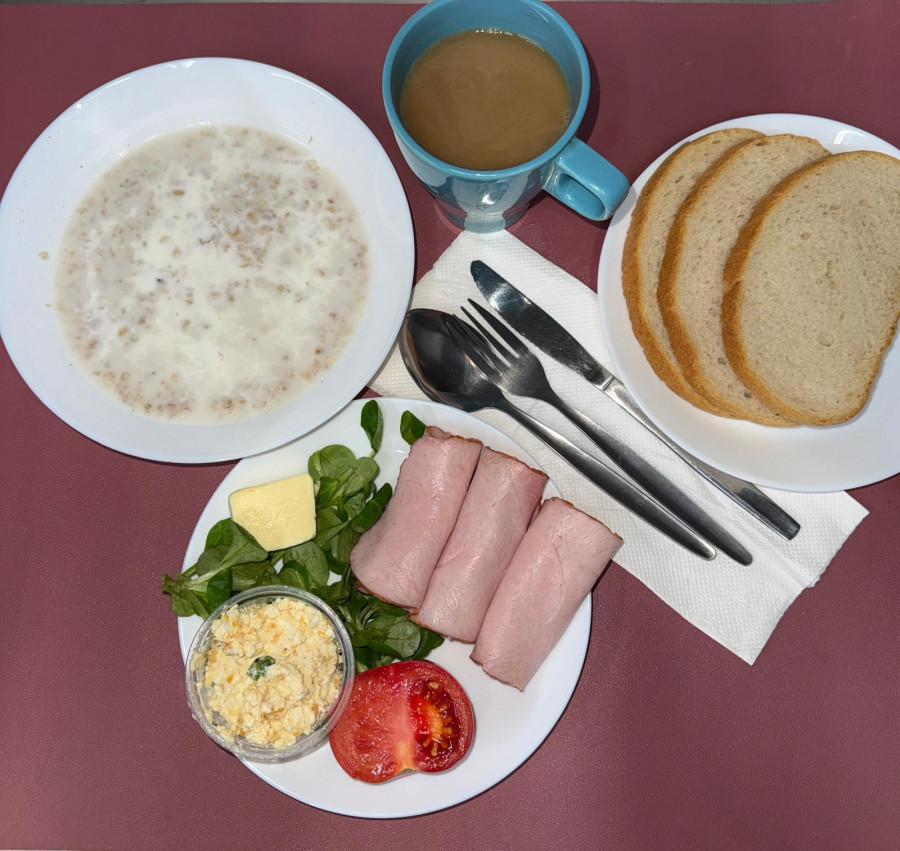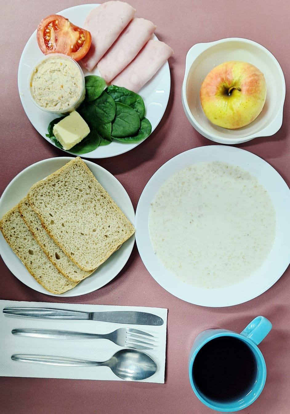 Składniki: zupa mleczna z płatkami jęczmiennymi 250 ml, pasta mięsna 70 g, szynka wieprzowa 50 g, pomidor 60 g, szpinak liście 15 g, masło 10 g, pieczywo razowe 90 g, herbata owocowa 250 ml