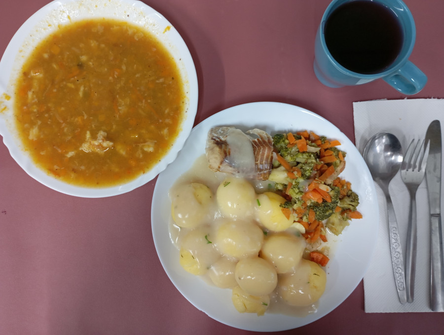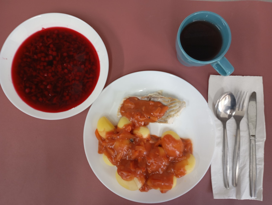 Składniki: Barszcz czerwony z ziemniakami 350 g, ryba na parze 110 g, sos grecki 150 ml, ziemniaki z koperkiem 250 g, kompot owocowy bez cukru 250 ml