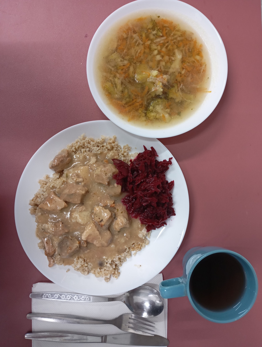 Składniki: Zupa brokułowa z ziemniakami 350 ml, gulasz wieprzowy 200 g, sos 100 ml, buraczki bez cukru 150 g, kasza jeczmienna na sypko 250 g, kompot owocowy bez cukru 250 ml