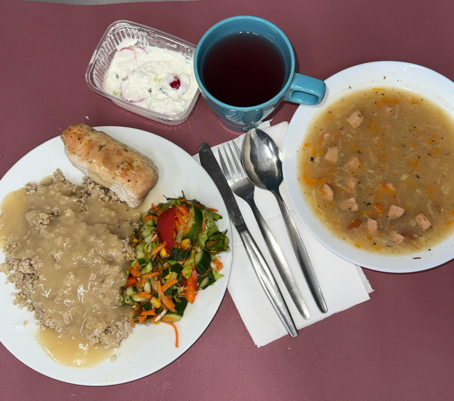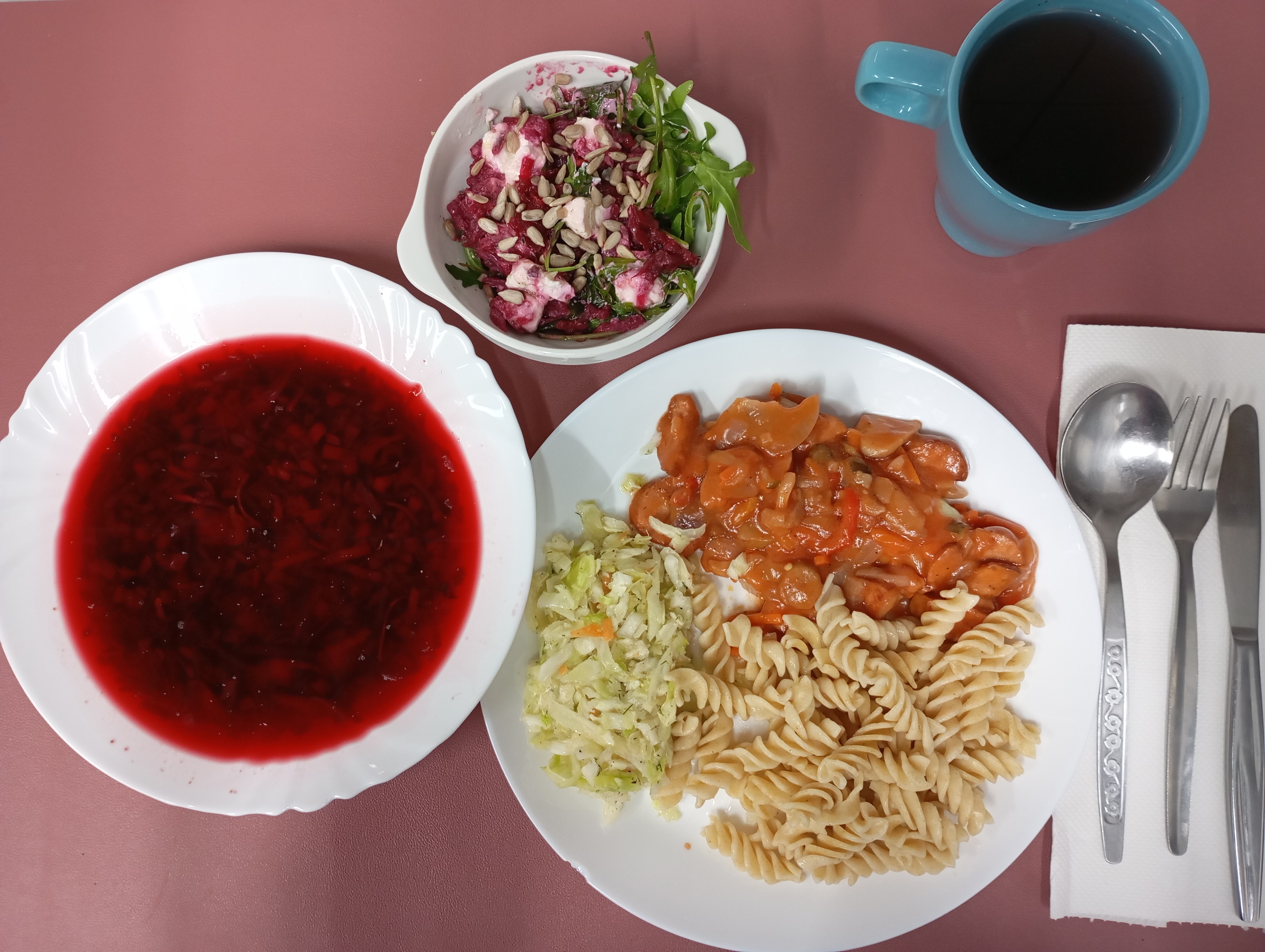 Składniki: barszcz ukraiński 350 ml, makaron razowy z sosem węgierskim i warzywami 350 g, surówka z kapusty białej bez cukru 150 g, kompot owocowy bez cukru 250 ml