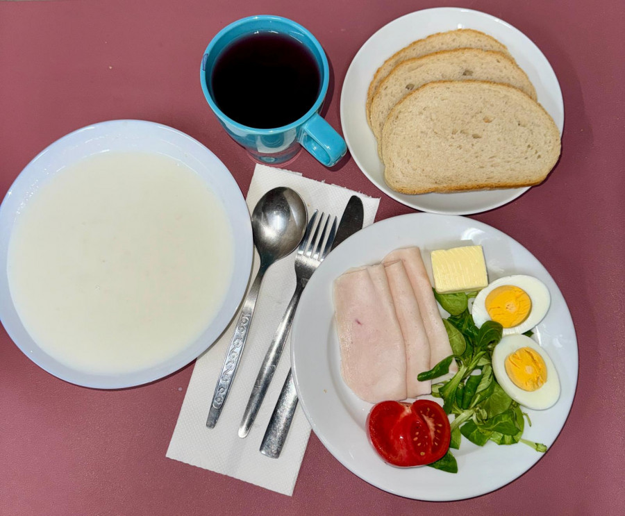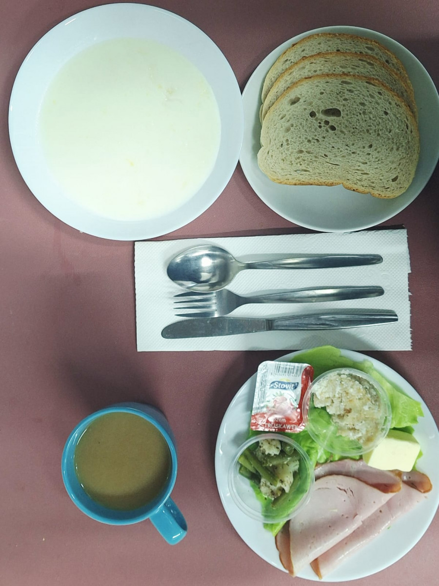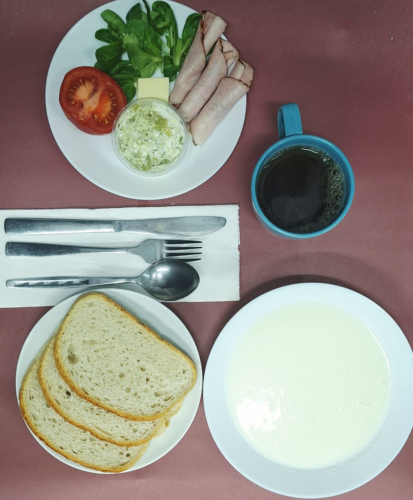 Składniki: zupa mleczna z ryżem 250 ml, jajko gotowane 1 szt, szynka drobiowa 50 g, pomidor 60 g, szpinak liście 15 g, masło 10 g, pieczywo pszenne 90 g, herbata b/c 250 ml