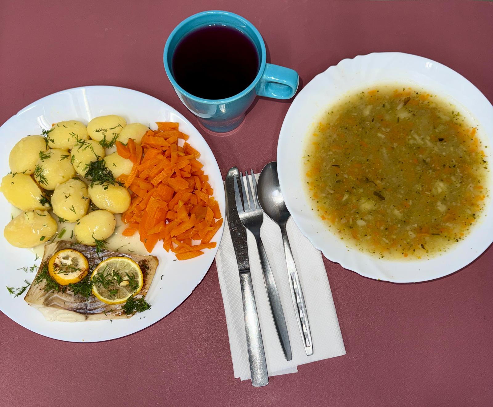 Składniki: zupa brokułowa z ziemniakami 350 ml, ryba pieczona z cytryną i koperkiem 110 g, marchew gotowana 150 g, ziemniaki z koperkiem 250 g, kompot owocowy bez cukru 250 ml