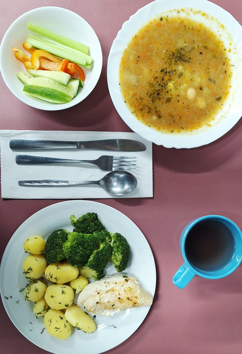 Składniki: zupa fasolowa 350 ml, roladka drobiowa z warzywami duszona 110 g, ziemniaki z koperkiem 250 g, brokuł z wody 150 g, kompot owocowy bez cukru 250 ml