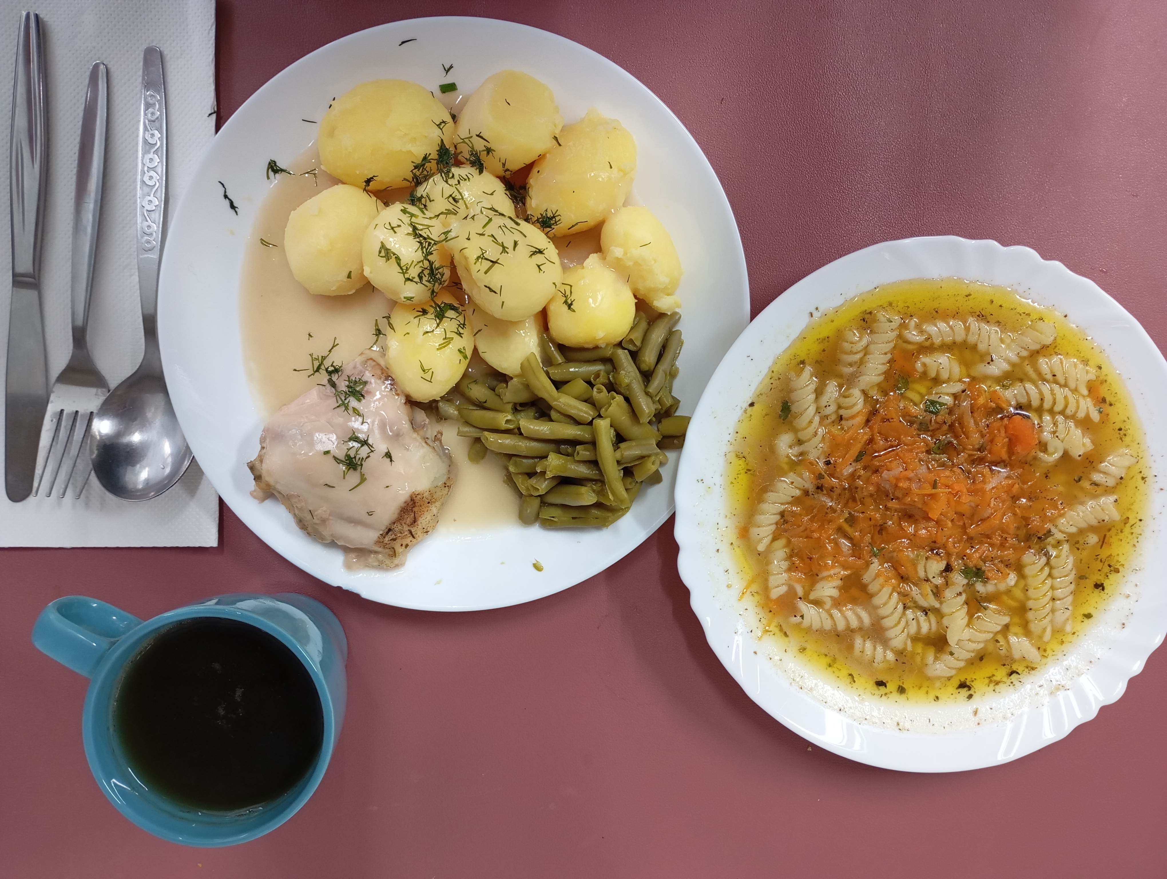 Składniki: marchwianka z makaronem 350 ml, udko duszone 150 g, fasolka szparagowa z wody 150 g, ziemniaki z koperkiem 250 g, kompot owocowy bez cukru 250 ml