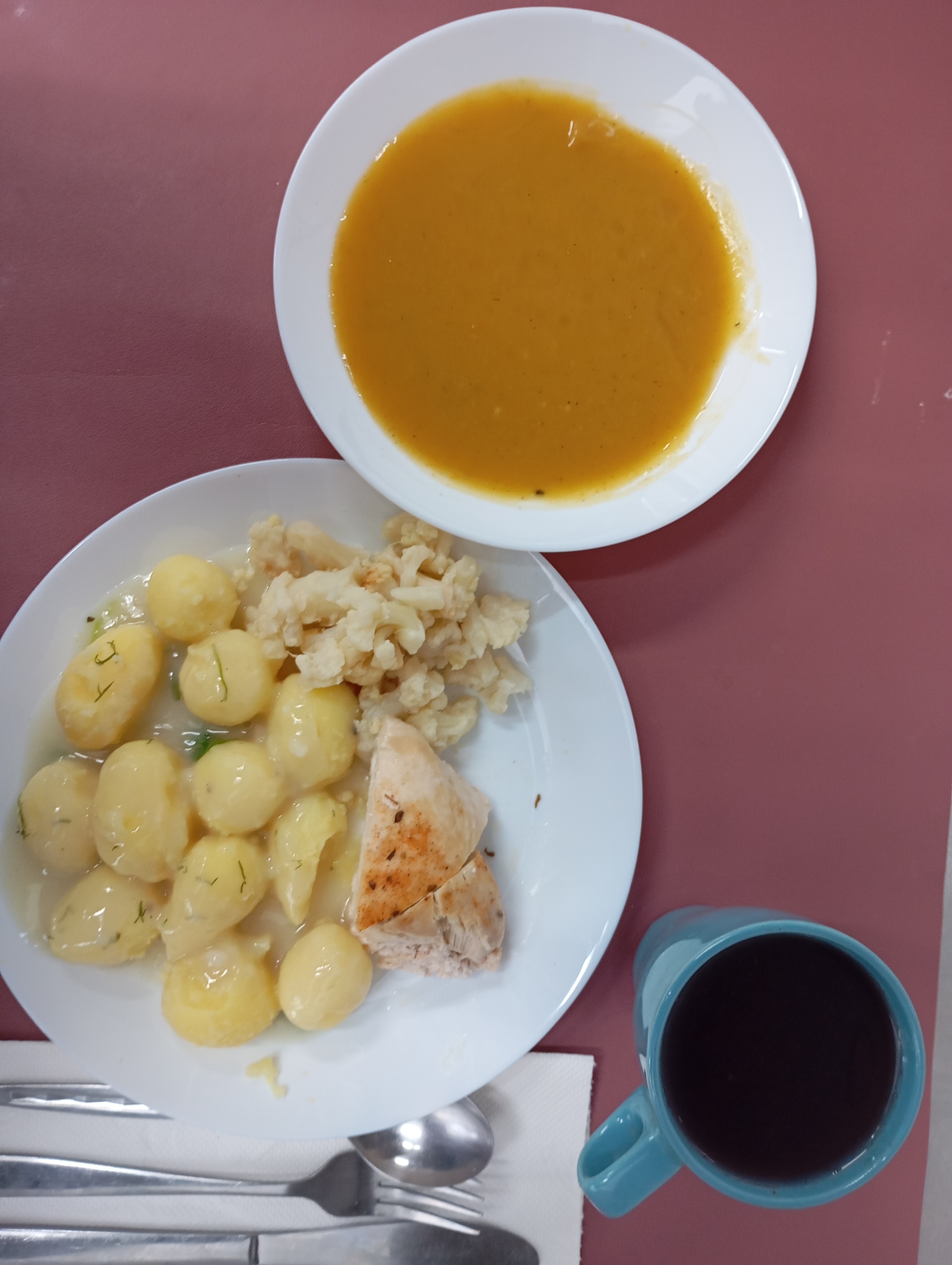 Składniki: Dyniowa krem 350 ml, filet z kurczaka gotowany 100 g, sos pietruszkowy 100 ml, kalafior z wody 150 g, ziemniaki z koperkiem 250 g, kompot owocowy bez cukru 250 ml