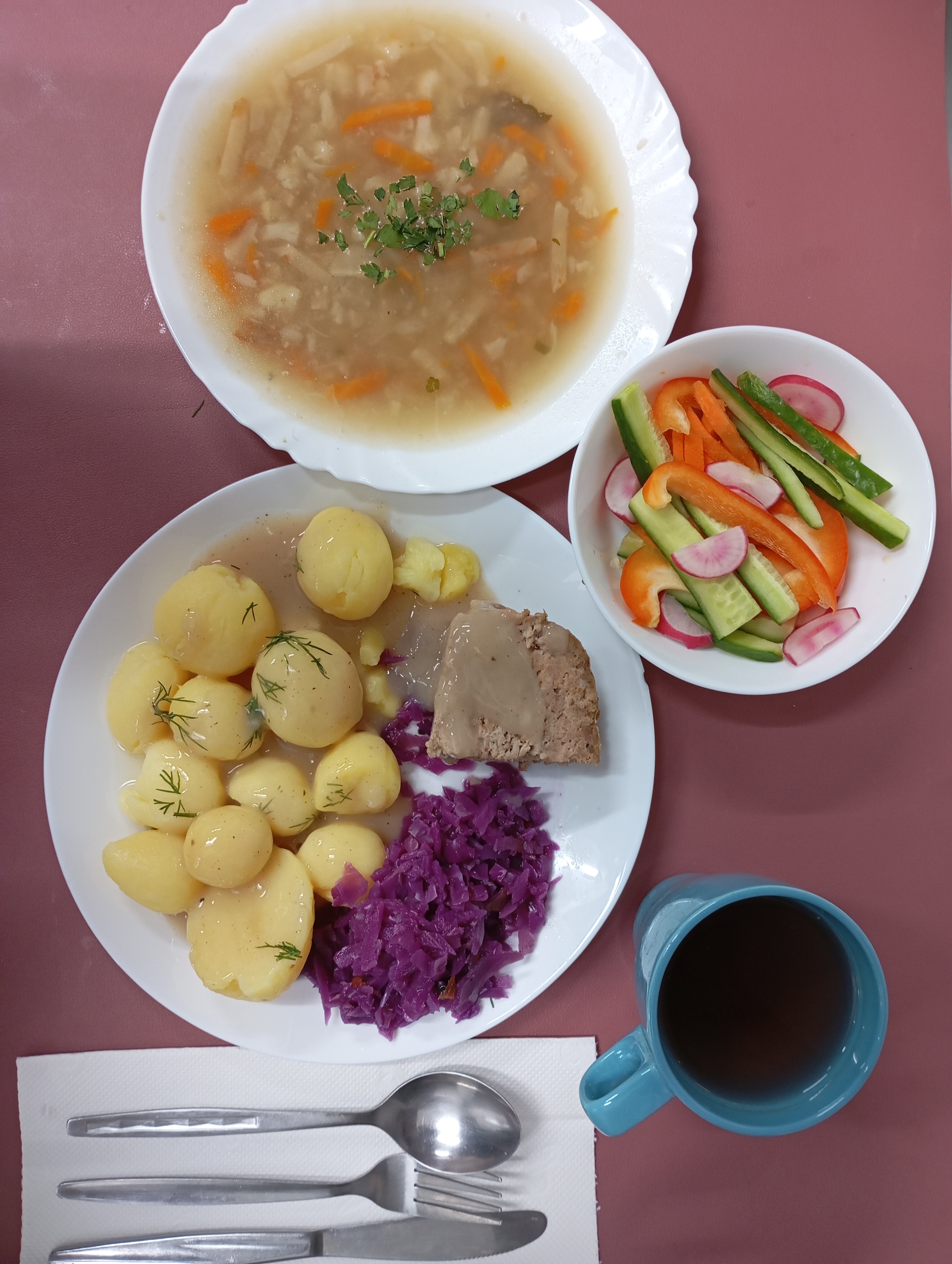 Składniki: zupa kalafiorowa z ziemniakami 350 ml, pieczeń rzymska 110 g, sos 100 ml, ziemniaki z koperkiem 250 g, kapusta modra na ciepło 150 g, kompot owocowy bez cukru 250 ml