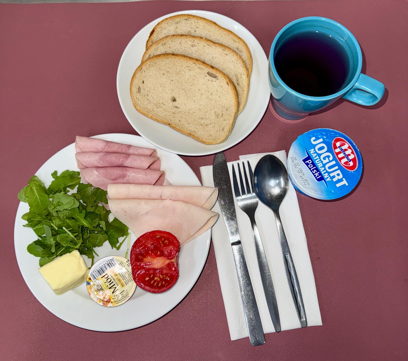 Składniki: jogurt naturalny 1 szt, szynka drobiowa 50 g, polędwica drobiowa 50 g, miód 25 g, pomidor 60 g, rukola 15 g, masło 10 g, pieczywo pszenne 90 g, herbata owocowa 250 ml