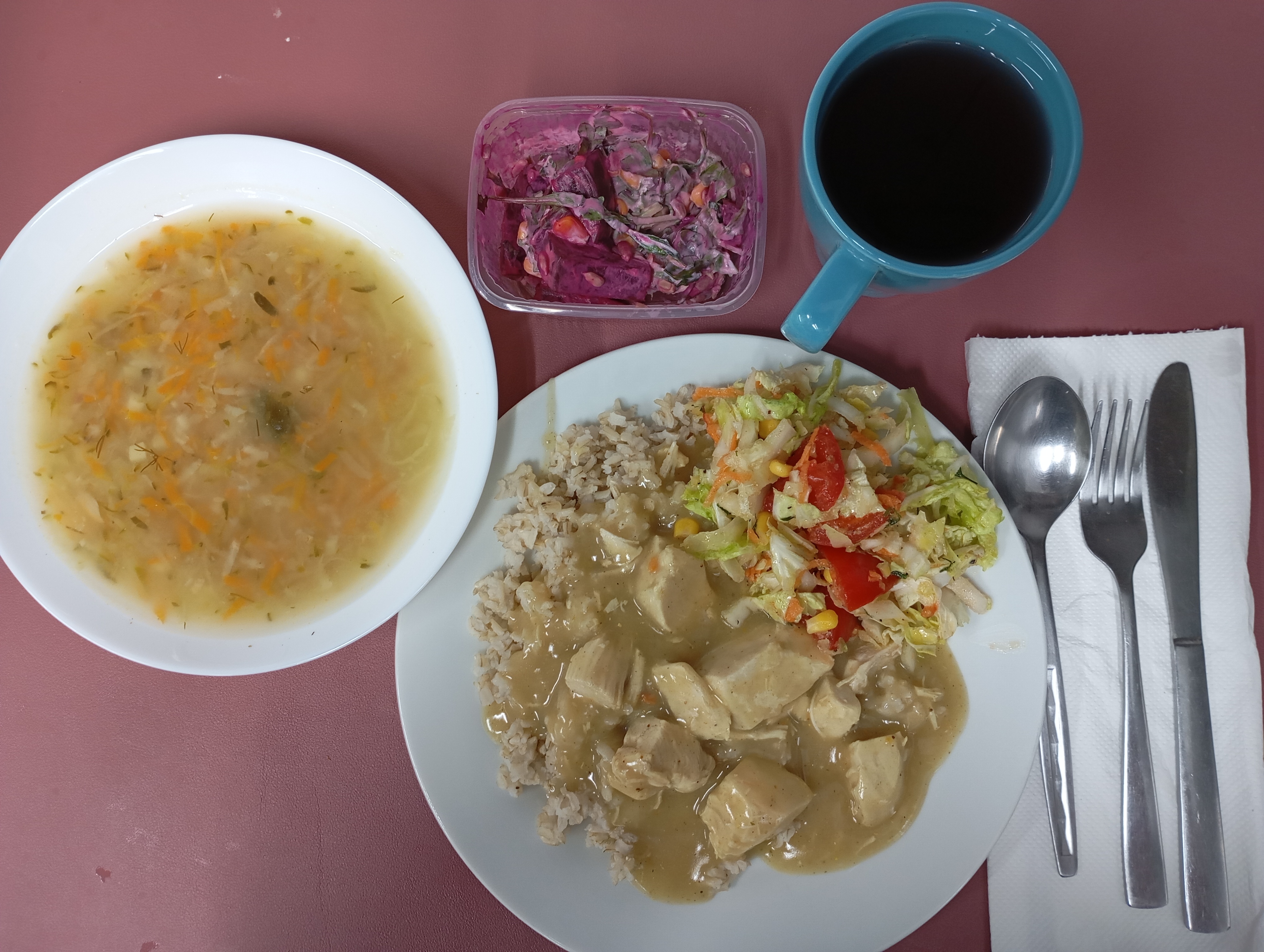Składniki: zupa ogórkowa z ziemniakami 350 ml, kawałki kurczaka w sosie curry 200 g, surówka z kapusty pekińskiej bez cukru 150 g, ryż brązowy na sypko 250 g, kompot owocowy bez cukru 250 ml